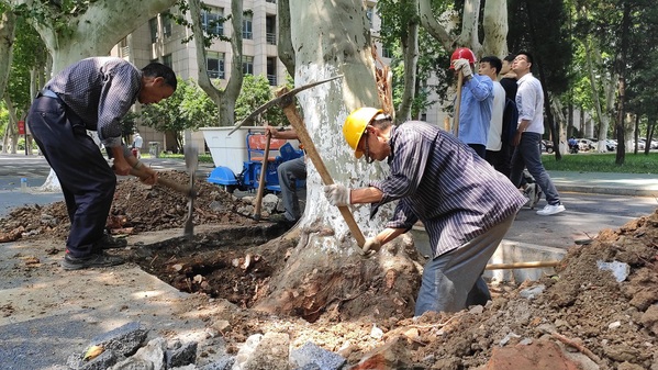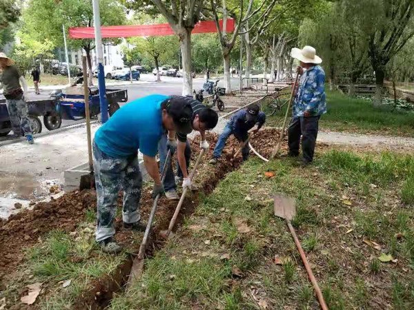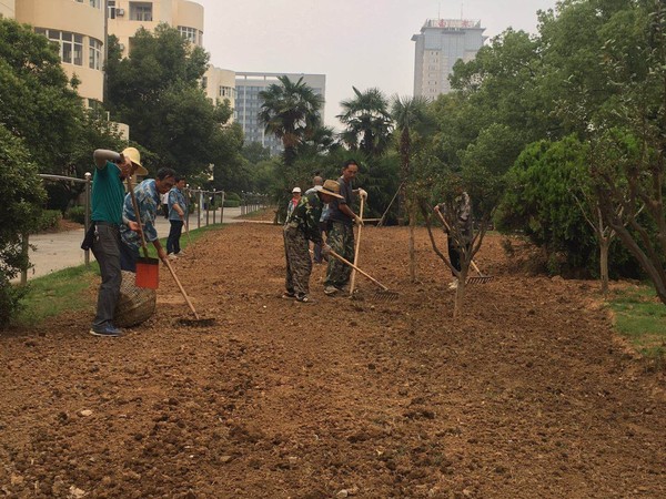 将军路校区克服高温酷暑进行雨污分流绿化恢复项目施工,预计将栽植色块6千平方,乔木500余株,麦冬草皮,草花等地被2万平方左右。