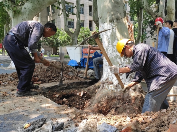 校园服务中心员工抓住暑期空挡,进行雨污分流绿化恢复项目施工,栽植“色块”6千平方米,乔木500余株,麦冬草皮、草花等地被2万平方米左右。从路面保洁到弱电工程施工,从行政楼到家属区,从室外的道路、绿地的施工到室内绿植的养护,他们挥汗如雨,只为“扮靓”我们的校园。