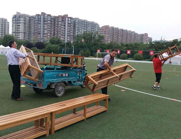 物业管理中心员工暑期定时排查楼栋隐患,做好物业保洁和极速抢险工作,做好学校暑期活动的场地布置和现场服务保障工作。值班员为了搭设展台,一直工作到凌晨3点。