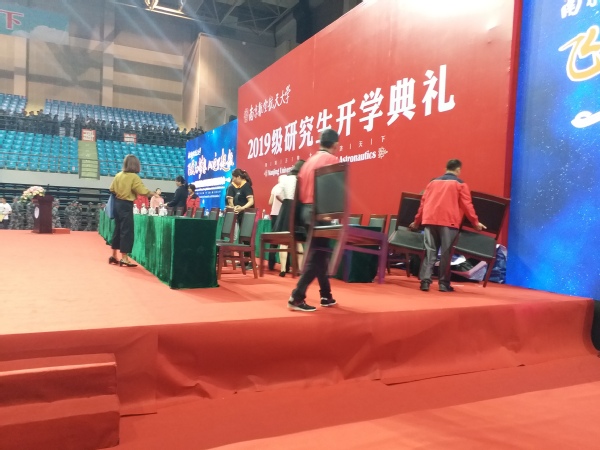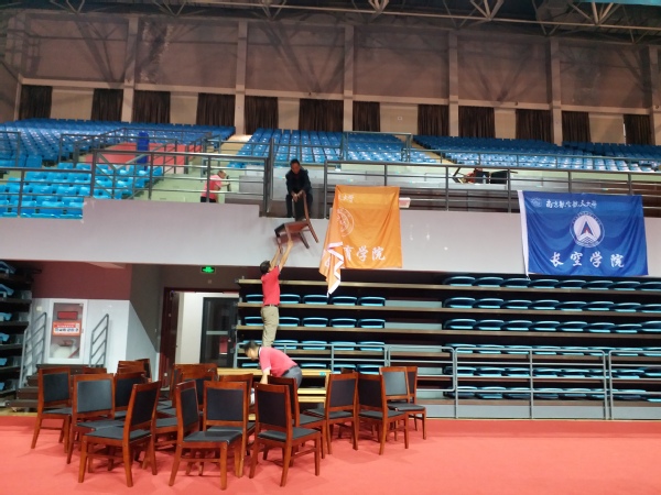 前期准备时,将军路物管部安排员工密切配合学生处和研究生院做好现场布置,同时安排保洁人员加班加点,全面细致地清理体育馆内场地的卫生,对活动会场四周卫生进行全面检查、出新,营造整洁舒适的环境。经过3天的精心准备,现场布置完成,所有需要的会务物品准备就绪。