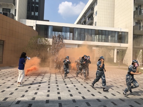 整场消防演练围绕多种模拟火情展开。第一项为火灾撤离演练,报警器响起后,模拟烟雾迅速在B1宿舍楼内向外弥散,全体师生在物业管理部工作人员的引导和组织下有序从楼梯口撤离,在撤离的过程中大家都弯腰贴墙、用湿毛巾捂住口鼻,有效地保护了自己。待师生们疏散至空旷的安全区域后,相关负责人清点人数,确保所有人及时逃生。
