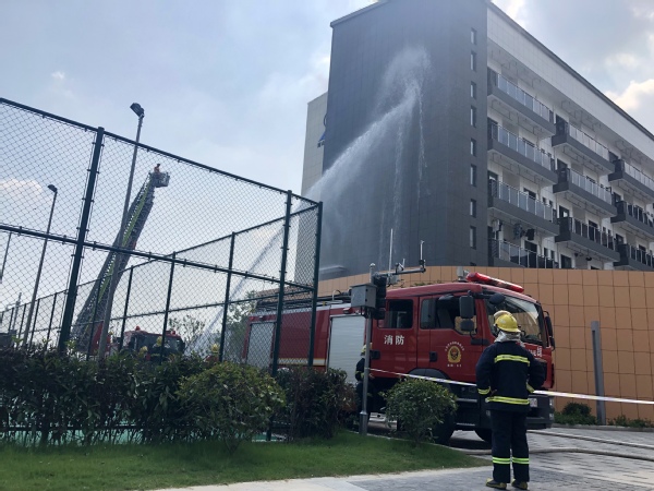第二项为灭火实战演练,后勤扑救小队在全体师生撤离完毕后,快速有序地携带灭火器奔向学生宿舍协助灭火。三辆消防车在水电维修部救援车的引导下在火灾险情区就位,消防队员在大队长的指挥下,迅速升起云梯,架设水枪阵地对“火势”进行扑救,防止“火势”蔓延,10分钟后“火势”被扑灭。