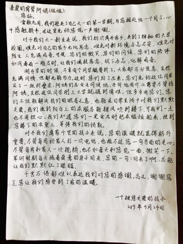 9月24日,后勤服务中心物业管理部B2栋学生公寓的管理员阿姨和值班员阿姨收到了来自民航学院一位同学的匿名感谢信,信中真切感谢了学生公寓阿姨们从开学以来对自己的悉心照料,句句发自肺腑。“对于我们离家千里的孩子来说,您的温暖就显得格外重要。尽管每周给家人打一次电话,也抵不过您一句当面的关心;尽管每周和家人一次视频,也不如每天和您见一面,微笑一下。军训时期每天拖着疲惫的身子回来,您的一句回来了啊,总能让我们默默红了眼眶。”信中如是写道。