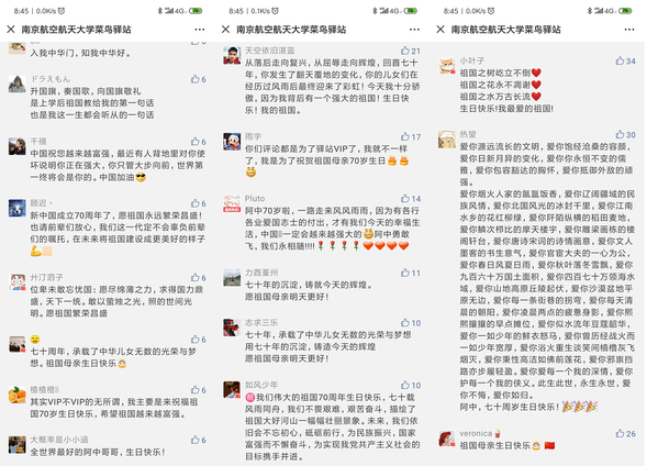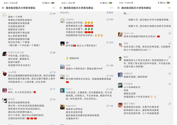 随着快递超市微信公众号活动推文的发出,同学们的朋友圈几乎被这篇推文刷了屏,很多同学在文末留言处写下了对祖国70周年的寄语和祝福。他们歌颂祖国的繁荣昌盛,感叹70年的巨变,把心中对身为华夏儿女的自豪之情表露无遗。