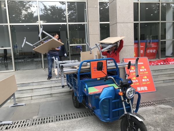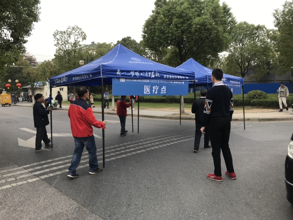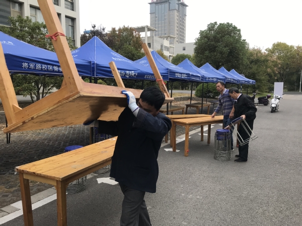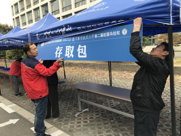 10月27日,2019江苏省大学生马拉松联赛南京航空航天大学第二届校园马拉松在将军路校区开跑。本次比赛有1600多名运动员和跑步爱好者参加。沿途需要设置存包处、医疗站、颁奖台、补给站等,将军路物管部接到任务后,提前进行周密谋划,积极协调,安排员工搬运桌椅,搭设帐篷,放置告示牌,并根据现场负责老师的要求进行调整定位。赛前有大约40顶帐篷、100张桌子和200张凳子,全部按要求放置到位。
