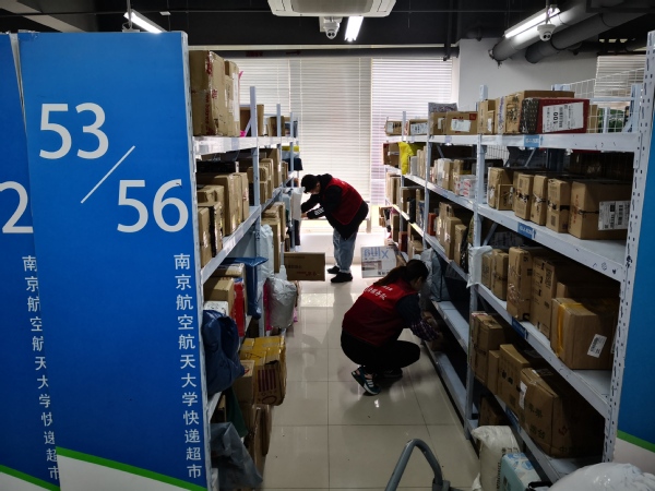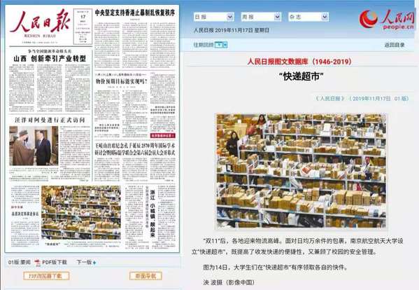 11月17日,我校“快递超市”被《人民日报》头版图片报道:“双11”后,各地迎来物流高峰。面对日均万余件的包裹,南京航空航天大学设立“快递超市”,既提高了收发快递的便捷性,又兼顾了校园的安全管理。