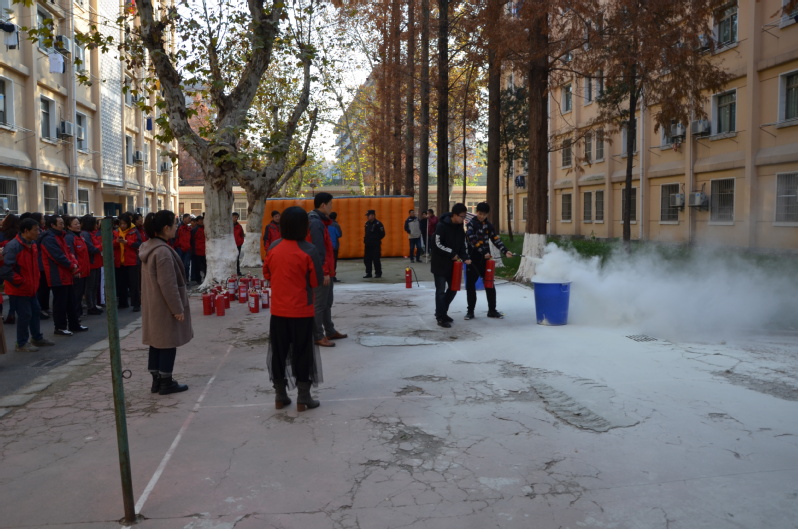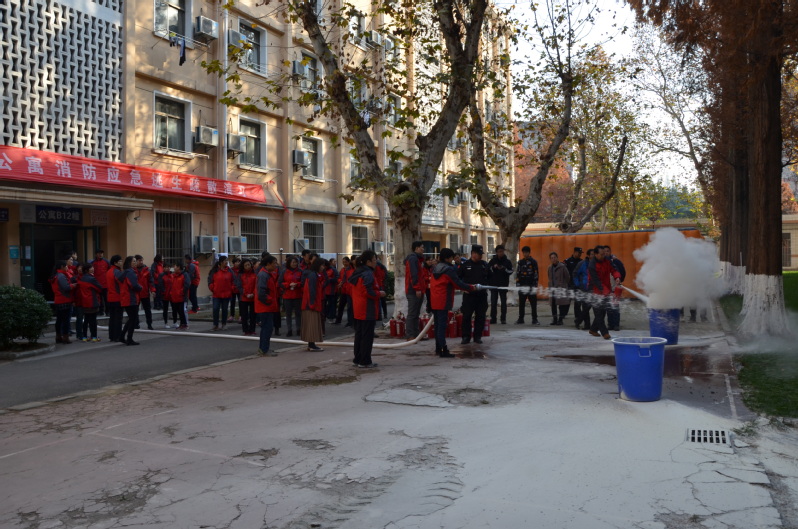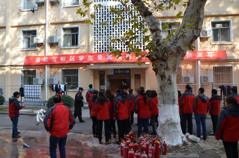 本次消防演练分理论培训和实践操作两部分。演练开始前,公寓服务中心宋军随机向管理员提问《高层公寓楼消防灭火和应急疏散预案》的具体步骤,管理员均能准确回答。理论培训中,梁润重点培训了灭火器、消防水带的使用说明和灭火的基本方法,并进行了现场演示。大家依次进行实践操作,体验消防器材的使用和操作程序;紧接着公寓员工与学生三人为一组进入浓烟强烈的逃生屋,根据掌握的逃生技巧安全从出口逃出。上午10:30,各项工作准备就绪,12栋公寓201室随即冒出黄色浓烟,在校保卫队队员与公寓应急指挥小组等人员的通力协作下,二楼火情很快得到了控制、楼内学生也很快疏散到楼外广场空地。