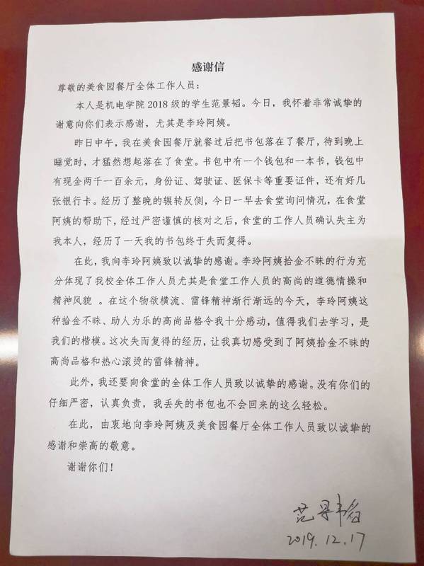 12月17日早晨,范景韬来到美食园寻找书包,收银员在与该同学仔细核对书包内的物品后,确认对方是失主无疑,便将书包返还。范景韬取回书包后,对拾金不昧的保洁员李玲和细心保管的收银员十分感谢,便送上了这封感谢信。李玲作为南航食堂一名普通的保洁员,在平凡的岗位上,用自己的实际行动维护了饮食服务中心的良好形象,传递正能量。