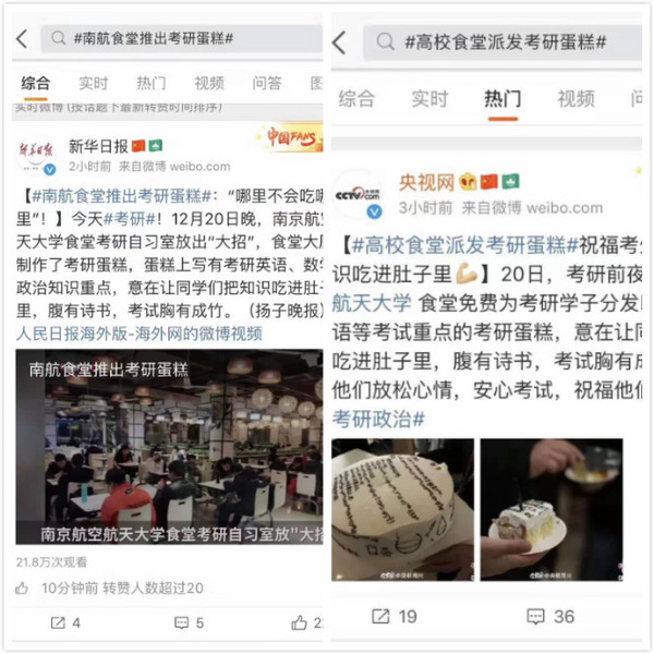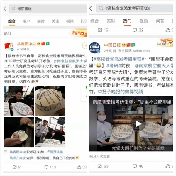 近日,南航食堂推出考研蛋糕的活动得到包括人民日报、共青团中央、央视网、中新网等主流媒体微博报道,话题浏览量超过7000万。江苏卫视、扬子晚报,现代快报、新华日报等权威媒体也对本次活动进行了报道。