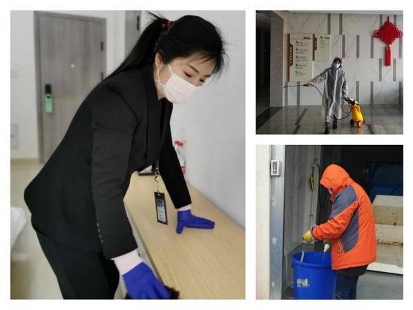 寒假期间天目湖后勤人依旧没有懈怠,所有值班人员佩戴口罩上岗,做好个人防护,积极做好楼宇内及校区公共区域卫生保洁工作,集中清理校园卫生死角。对各楼宇内、公共区域、进行全方位84消毒液喷洒,定期对电梯轿厢、按键进行有效消毒。