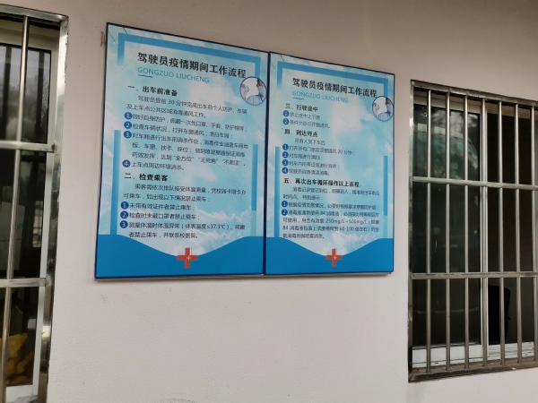 为了让师生放心乘座学校班车,我们在班车排队等候区放置了乘车流程展板,提示乘客乘车规范、介绍车队在防控疫情期间的消毒程序。师生可以按照展板提示,配合车队工作人员进行乘车前检查消毒工作:隔位排队、戴口罩、测量体温、刷卡上车、师生隔位乘座等。