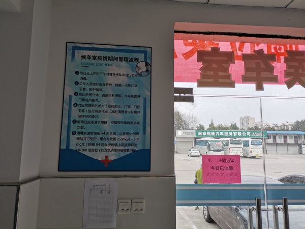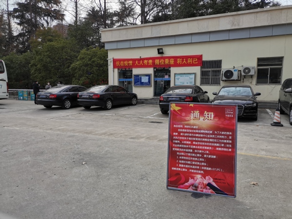 为及时做好师生在疫情期间乘座班车注意事项的提醒工作,中心在场地入口处和候车室分别放置了温馨通知板和“抗击疫情,人人有责,隔位乘座,利人利已”的红色横幅,提高乘客自我防范意识。