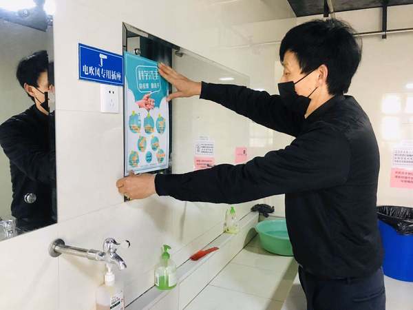 在学生返校前,公寓服务中心各区域多次召开专项工作会议、相关工作培训会议,提前部署安排各项工作:公寓楼环境卫生保洁、楼内公共部位消毒、防疫物资储备、防疫宣传单张贴,员工上岗前培训等各个方面做好全面准备。4月初,管理员对管辖楼宇宿舍进行开窗通风换气,同时对个别宿舍内霉变食物、垃圾进行处理。在公共盥洗室、套间洗手台处张贴“七步洗手法”、摆放洗手液;在公寓楼大厅摆放“学生公寓新冠病毒疫情防控指南”展板。各楼栋认真检查公共设施设备,确保电器正常运行。中心4月中旬已全面做好开学前准备工作,严正以待。
