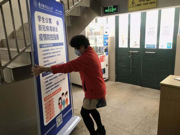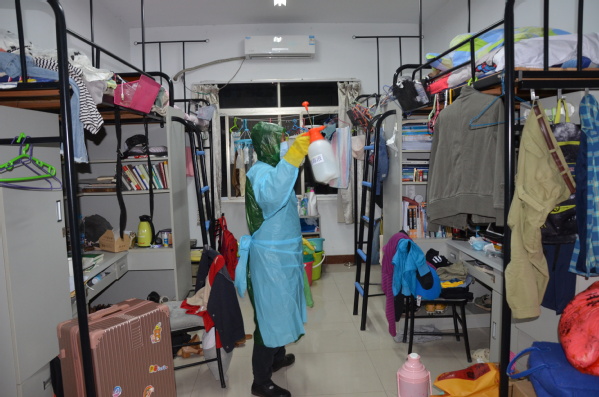 学生返校期间,学生需佩戴口罩,持本人“i.南航APP”绿码进入公寓楼。公寓管理员为学生测温,体温不超过37.3℃,核对返校名单无误后,学生进入宿舍。中心为每位同学发放水银温度计,并告知学生每日需自行测温三次,一旦出现不适症状,第一时间上报辅导员,同时向学生宣传疫情期间公寓日常管理新规定。中心做好发热同学处理应急处理流程,并安排专人待命处理应急消杀工作。公寓做好每一个环节确保公寓环境安全。