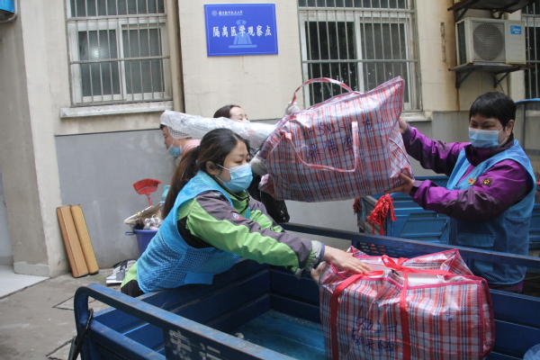 疫情防控对学生公寓卫生环境标准提出更高要求。公寓保洁员每天两次对楼内公共区域进行消杀,及时清运处理生活垃圾,确保楼内卫生环境,对于超负荷的工作量,保洁员们不退缩、迎难而上。疫情期间学生就餐问题,楼内一次性餐盒量将剧增,中心未雨绸缪,在楼前摆设2个“一次性餐盒专用垃圾桶”、楼内各层水房、套间内摆放“饭菜泔水专用桶”,倡导学生就餐后自行将餐盒带至楼下扔进专用垃圾桶内,培养学生良好的生活卫生习惯。