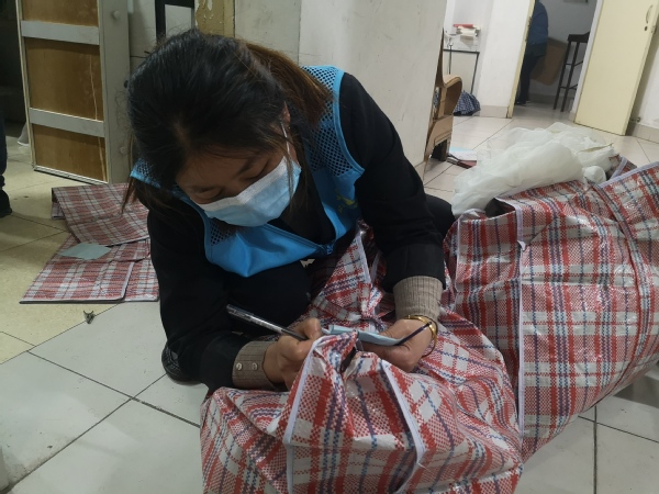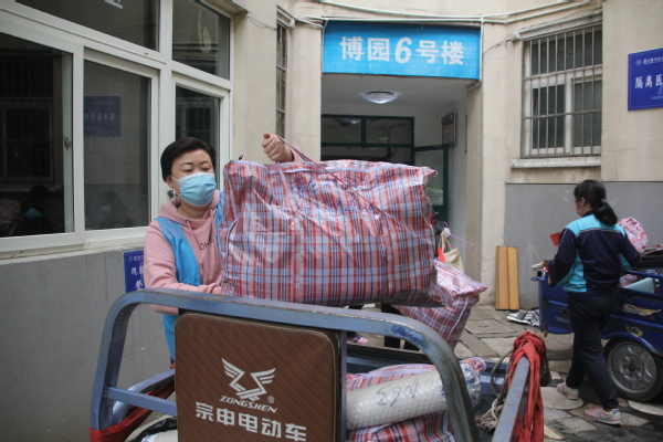 人员部署工作做好后,抗疫战斗冲锋号即刻吹响,第一步就是腾空楼栋。由于大一学生暂不返校,无法第一时间回到宿舍打包行李,公寓员工主动承担起帮长空学院学生打包运送行李的任务,4月21日上午,60多名管理员、保洁员齐上阵,首先帮50多名大一学生打包行李,总计超过600件。他们小心翼翼将学生的个人物品有序归纳,将床上用品、被褥叠好后严密包裹,易碎物品小心装袋。空军选培办公室库房内柜子、单人床等重物多达百件,每件重达数十斤以上,六层楼内没有电梯,只能靠人力。公寓员工们两两配合,互相协作,把重物扛在肩膀上,缓缓搬出。四月的南京,春风中带有阵阵凉意,但几趟楼上下,他们却早已大汗淋漓,每个人都顾不上休息,将行李搬至车上后,再次返回楼里忙碌。