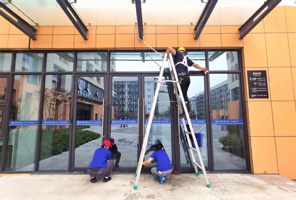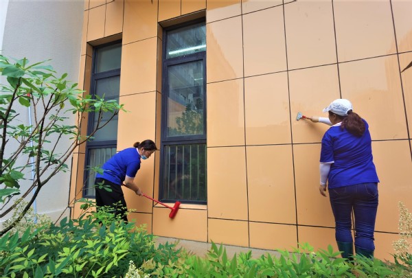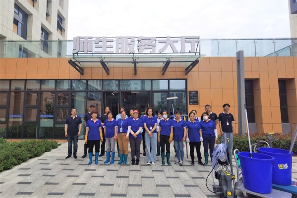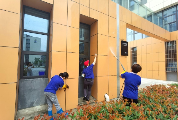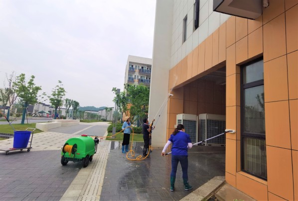 在为期5天的劳动清扫过程中,物业管理部的员工们热情洋溢,采取分组分区域的方式推进,避免人员聚集。大家发扬不怕脏、不怕累的精神,积极参与、分工合作,用最高清洁标准对待每一寸区域,做到环境卫生不留死角,清洁消毒不留空白。根据安全工作规范要求,需要登高作业的员工佩戴专业的防护用具,使用功能齐全的清洁器具对校区各栋楼宇的外墙、玻璃廊檐等进行细致的冲洗清理。清洁完毕后,他们又马不停蹄地投入到室外垃圾桶、公共长椅、护栏标识牌、路灯杆等基础设施和绿化带、施工遗留死角的全方位清理活动中。清扫后的校园,在阳光的照耀下,显得格外干净,整体校园面貌焕然一新。