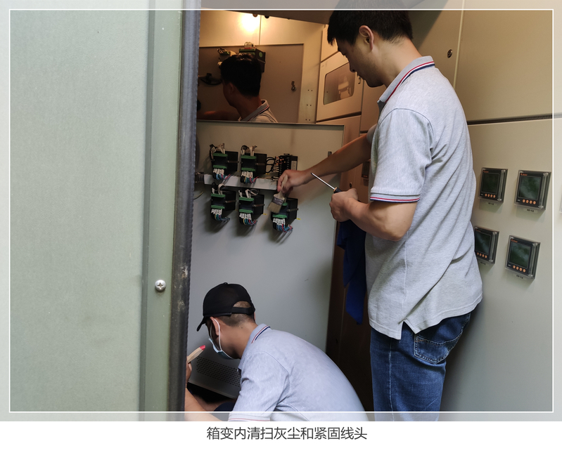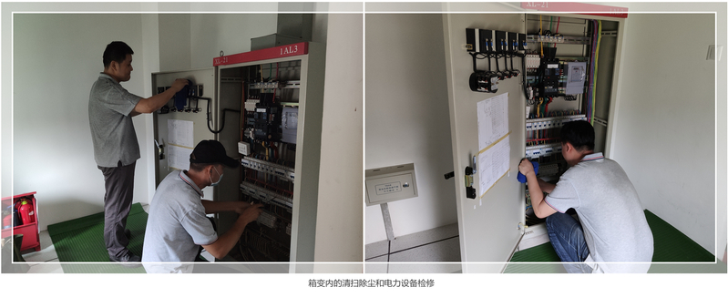 本次检修中,检修人员详细检查了箱式变电站内高低压柜、变压器等设备的运行情况,按规程对用电设备进行预防性试验,紧固所有开关柜内螺丝,清扫箱变内外卫生,检查是否存在用电安全隐患。