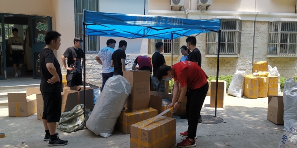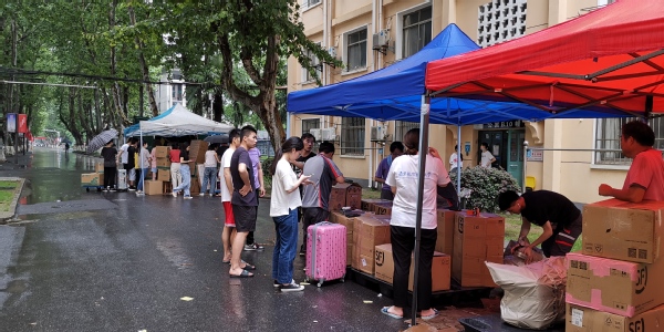 6月初,中心组织召开专项工作会,提前部署相关事项,对毕业班学生住宿分布情况进行摸排和实地踏勘,在选择服务点时尽量方便学生,为了降低雨季影响,要求各服务商完善应急预案,备足帐篷、塑料布以及接驳车辆等。服务期间,中心安排专人对两校区的收寄现场进行监督和协调。此外,在集中服务时间段以外,为了满足部分延期毕业学生的寄递需求,将军路校区快递超市专门为他们到宿舍楼下增设了临时收寄摊点,为学生提供服务便利。