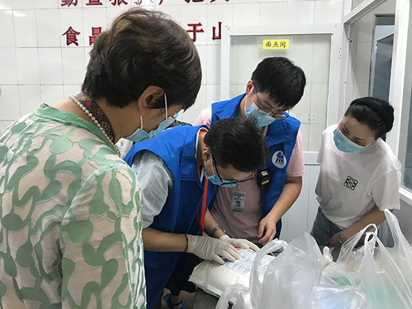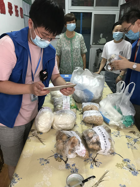 2020年7月8日上午9时,南京市市场监督管理局两名专业抽检人员来到幼儿园进行食品抽检工作。依据《国家食品安全监督抽检实施细则(2020年版)》相关规定,工作人员查验了解了食品原料的进货和验收渠道等方面的资料信息,并重点对幼儿园当天的大米、黄豆、面粉、生姜等原材料以及部分已烹饪熟食进行了足额抽样。本次抽样过程公开、透明、规范,对取样产品进行了严格的封装、登记、拍照程序,确保抽样工作的真实性和有效性。