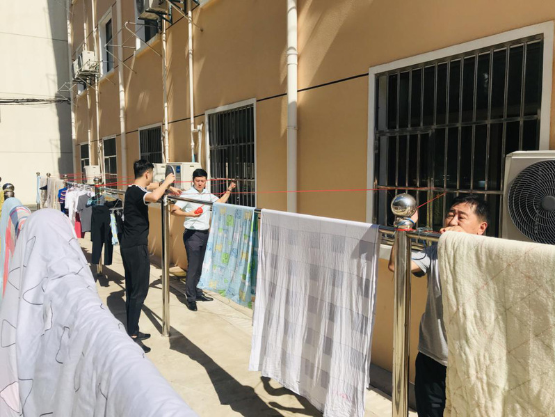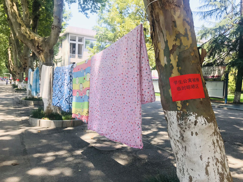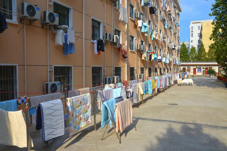 为了同学们回到学校后,有充足的空间晾晒衣物、卧具等,公寓人马不停蹄地行动起来,他们查好天气、算好时间、分工明确、井井有条。公寓人想尽办法,充分利用现有条件,额外拉设晾衣绳,为的就是让同学们回来的时候,衣物和卧具都可以晒到久违的阳光。