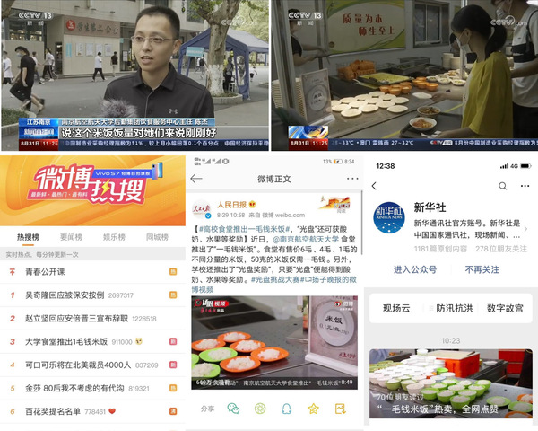 习近平总书记近日对制止餐饮浪费行为作出重要指示,后勤集团迅速响应、主动作为,切实将“厉行节约、反对浪费”落实到实际行动中。学校食堂在原有“光盘打卡”“光盘有奖励”等活动的基础上,推出“一毛钱米饭”,学生花一毛钱就可以买到一份50克的米饭,此举受到学生的广泛好评,同时也得到了央视等主流媒体的关注报道。人民日报、新华社、新华网、央视新闻频道、中国日报、中国青年报、新华日报等媒体进行了集中报道,进入微博热搜前3名,阅读量突破1.6亿。