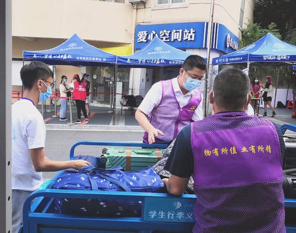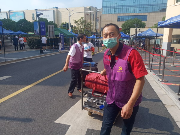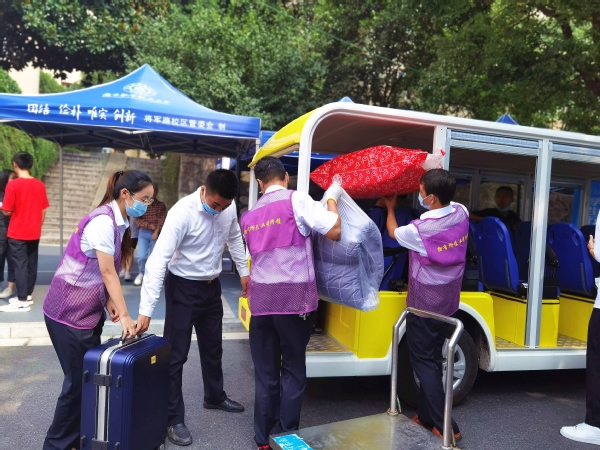 将军路校区近期陆续迎来研究生新生和大一新生分批开学入校。每天校门口人流量都极大,上午10点左右是新生入校的高峰期。中心支部11名党员同志、多名入党积极分子和志愿者们在校区北门、大西门口奔走忙碌,大家身穿紫马甲,以饱满的热情和温暖的笑容,接过新生手中的行李,指引学生乘坐行李义务接驳车,并将行李小心翼翼地搬上车。物业的志愿运送车为新生提供了方便,被新生称为小小“专车”,多次往返新生宿舍和校门口之间,一刻不停歇地将学生安全送达相应的宿舍。