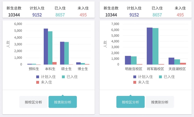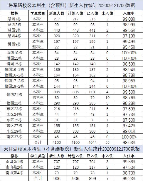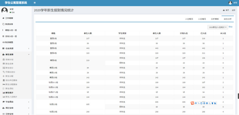 此次迎新工作顺利使用公寓管理系统中的新生入住统计模块,到校的学生在领取钥匙后进行入住由公寓工作人员确认,通过南航后勤服务板块可以实时掌握已办理入住新生数据。为确保各栋录入数据的全面性、完整性、及时性、准确性,中心组织培训,安排专人检查、督促、指导相关学生信息数据录入工作,在公寓办公室也可以同步看到各公寓楼栋学生入住数据变化更新。