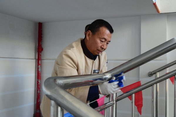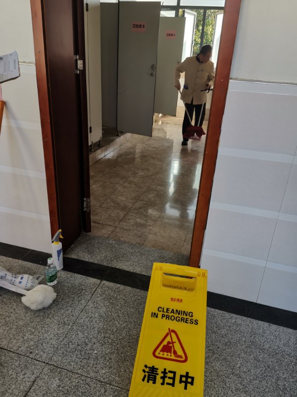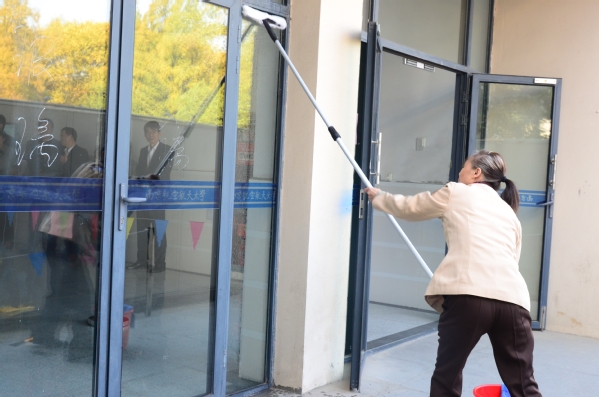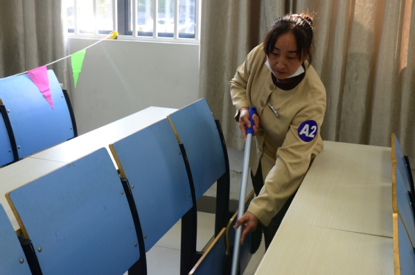 一声哨响,保洁员的现场实操比拼正式拉开序幕。四组保洁员按照抽签顺序,在引导员的带领下,紧凑有序地完成了教室保洁、玻璃刮拭、公共区域保洁、卫生间保洁共4个现场操作项目。比赛环环相扣,有条不紊。参赛选手专注比赛,展示技能。评委评判标准统一,严格计时打分。
