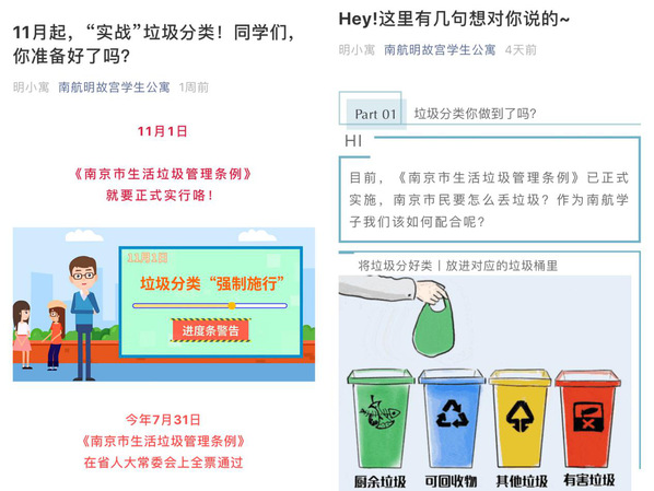 公寓服务中心按照集团相关部署,大力普及垃圾分类知识,利用公寓微信公众号、公寓宣传栏、学生联系群等阵地,开展垃圾分类宣传教育活动。同时为了让同学们能尽快地适应垃圾分类,中心提早谋划,于10月中旬在两校区所有公寓楼栋实行垃圾袋装化下楼,为本月开始的垃圾分类工作做好充足的前期准备,并将垃圾分类宣传海报翻译成英文,张贴在留学生公寓楼。