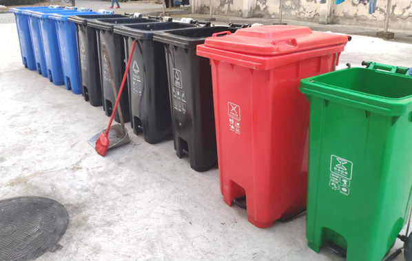 公寓服务中心在做好宣传教育的同时,根据集团统一安排,在硬件上设置规范的分类垃圾筒,在两校区垃圾分类试点楼栋前,换上颜色分明的“四色垃圾桶”,其余公寓楼前的大垃圾桶侧面均贴上“四色贴士”,引导师生进行规范的垃圾投放。