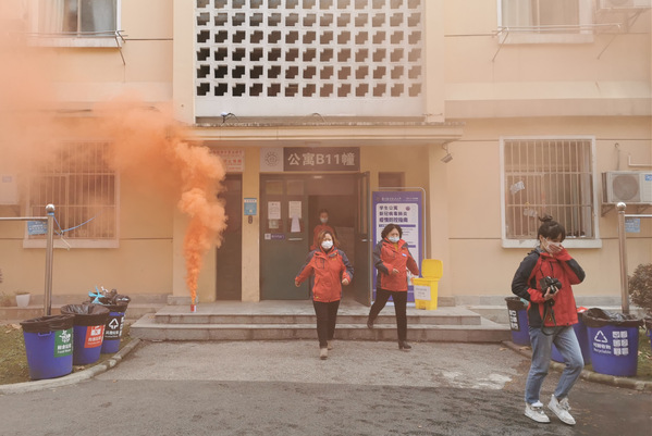 9点30分,实战演习在一阵烟雾、警报中正式开始。B11幢3楼突然传来火情,公寓管理员收到火情通知的第一时间拨打明故宫校区负责人王子瑜助理的电话,王助理立即赶到现场,与此同时拨打校园报警电话。在王助理的部署下,管理员立刻关闭总电源闸门,打开所有消防通道门,使用就近的消防器材进行灭火,并迅速引导学生从安全通道撤离到安全地点。