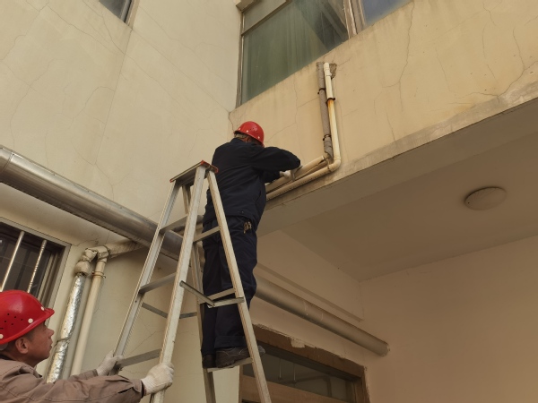 水电与维修服务中心立即启动极端天气应急预案,成立了一支由水电维修班组长、水工技术员和水电维修员组成的防冻突击队。从12月21日起,分两校区对各栋楼宇室内外包括楼顶水箱、供水管道、阀门、室外消防管网设备等进行保温防护。给楼顶部分裸露水管包裹保温棉、阀门覆盖草帘,将室内有水箱的门窗关好,为通透无门窗的水箱室加装草帘,水泵降压——保护完成的供水管道及阀门如同披上了一层温暖的外衣,将有力对抗强寒冷天气。