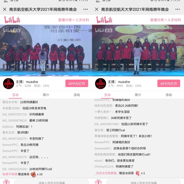 20点左右,阿姨们的节目如约而至。嘹亮的歌声唱响时代风采,举起的手臂满含深切情谊。阿姨们身穿红色棉服精神抖擞的站在舞台中央放声歌唱,歌声里满含对祖国的深情,对学生们的关爱,灯光洒在她们脸上,全体阿姨满含笑容、配合默契,以富有感染力的表演将歌曲演绎得淋漓尽致。“表白25、26栋阿姨”,“36栋阿姨辛苦了”,“给我们杨忠霞阿姨打call”......直播互动顿时活跃起来,同学们看到自己楼栋的阿姨站在台上,纷纷点赞发言。