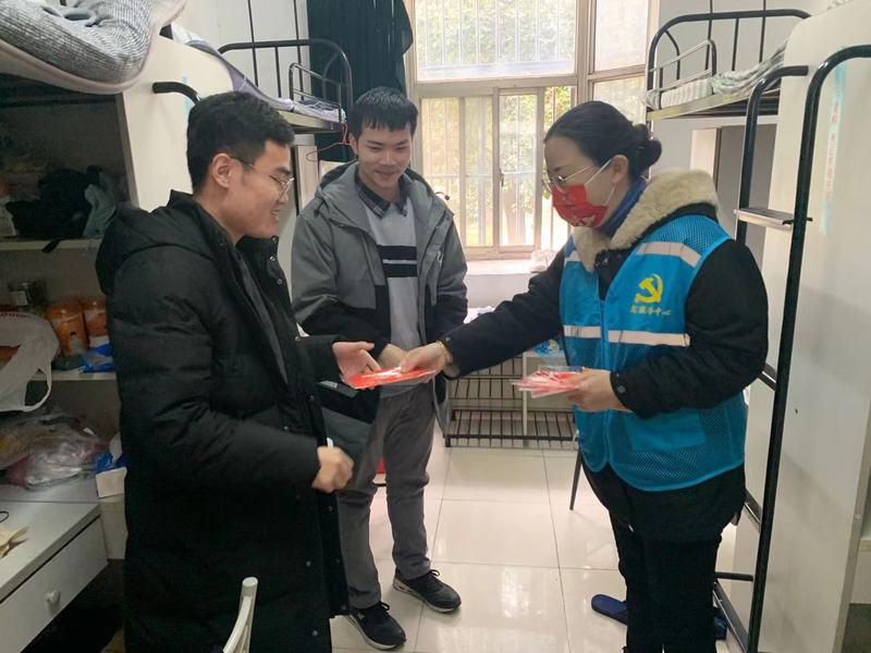 公寓支部特意为留校学生准备了具有春节特色的“福气”口罩,款式新颖、寓意美好。支部党员走访留校学生寝室,送上新春祝福及这份特别的礼物。学生们表示非常喜欢这款可爱寓意深刻的口罩,都不舍得戴了。党员们与学生交流,请留校的同学们,注意安全,保管好贵重物品。临时集中住宿,新舍友之间要互相关心、友好相处,共同度过一个安全喜庆祥和的寒假春节。寒假天冷“家”温暖,公寓就是你们的“家”,如遇困难需要帮助的,直接找公寓阿姨。