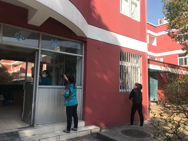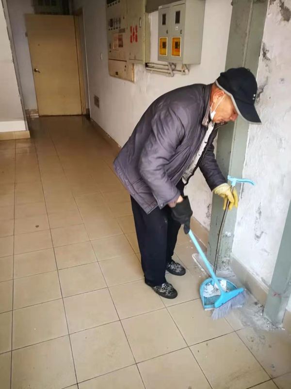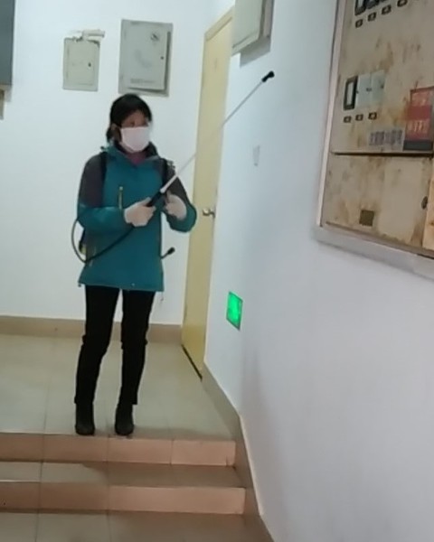 公寓楼都有一个大大的院子,北区的学生公寓院内道路两旁种着茂盛的香樟树,经过了一个冬季的休养,院内落满了香樟树的树叶和树种子,管理员带领值班员、保洁员一起,清扫的垃圾装了满满2车运到垃圾房。清理完楼栋卫生,还有一件非常重要的事情:喷洒消毒液。保洁员师傅扛着几十斤的消毒液在楼栋内仔细喷洒。很多师傅忙的水都顾不上喝一口。