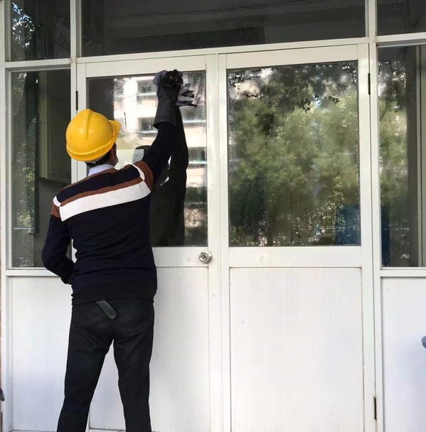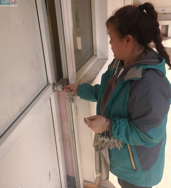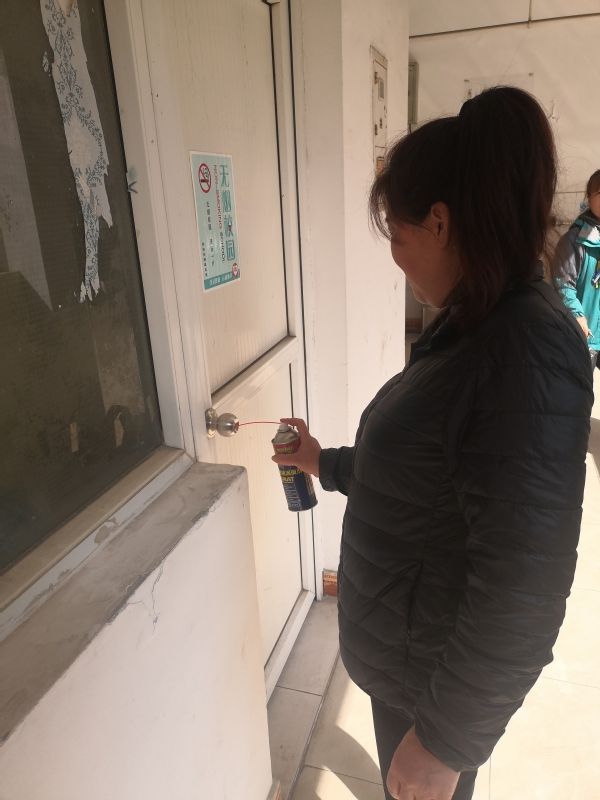 清理完门厅卫生以后,管理员们又到楼栋内给宿舍门锁挨个喷上除锈润滑剂,方便学生开学使用。打开宿舍检查电灯、风扇等设施,确保开学后设施正常使用。又带领保洁员师傅们一起到楼顶平台,检查雨水下水管口是否有淤泥、杂草丛生堵住,影响排水,及时清理。