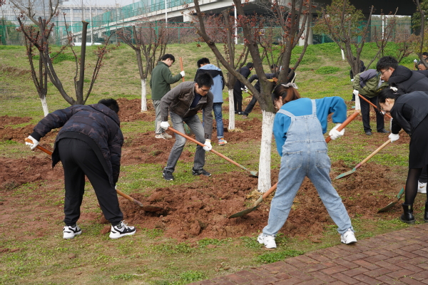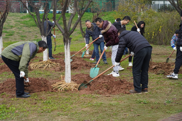 植树过程中,同志们相互配合默契,场面繁忙有序、气氛非常热烈,三五人为一组分工合作,互相配合,有的挥锹铲土、有的扶树填土,到处都是忙碌的身影。经过一个多小时的劳动,15棵紫叶李树在将军路校区东区“安家落户”,新栽种的绿化苗木为校园增添了一片新绿。