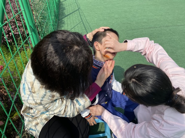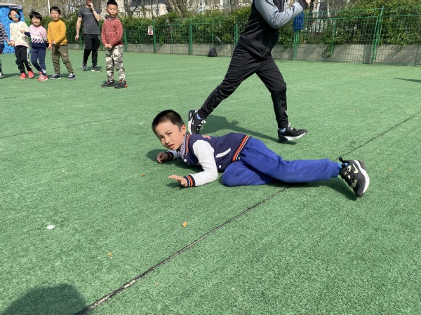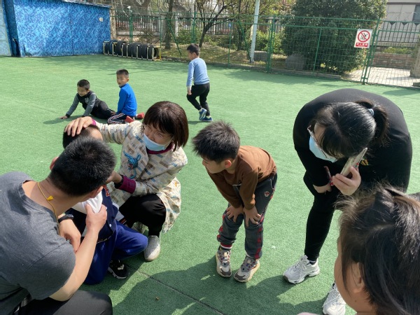 演练中,大三班的孩子们在体育老师的带领下正在进行体育活动,一位幼儿在跑步的过程中不慎跌倒,此时正在班级活动区域旁观察的老师发现后立即跑向受伤幼儿,并呼叫体育老师上前一同查看受伤情况。主班老师指挥班级保育老师向保健医生呼叫、求援,配班老师组织班级其余幼儿有序回到操场活动区域。保健医生接到求援电话后,立即上报园领导并迅速赶到受伤幼儿旁,查看幼儿伤口情况并进行现场伤口消毒处理。主班老师在旁安抚受伤幼儿,待幼儿情绪稳定后,保健医生将其带至保健室进一步观察,随后班主任老师及时通知家长告知幼儿情况并做好跟踪反馈。
