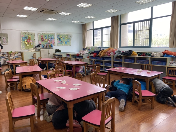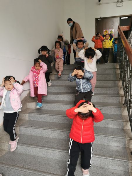 演练警报声拉响后,老师们立即停止了正在进行的教学活动,迅速指挥孩子们卷曲身体,双手护头躲到桌子下、墙角处。随后,老师们组织孩子们双手护头从楼梯的两侧迅速撤离到操场安全地点。疏散的过程中,演练工作组成员在各楼层的楼梯口加以指引、疏导指挥,防止孩子们在撤离的过程中出现相互拥挤的情况,确保疏散过程中的安全。