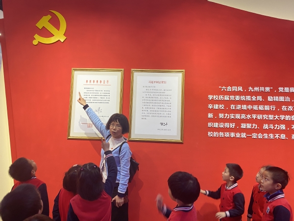 作为共产主义接班人,党史教育应该从娃娃抓起。大班的孩子们走进了位于校史馆内的党建教育场馆,在老师和讲解员的带领下,认识党旗、党徽,聆听共产党人的革命故事,了解今天幸福生活的来之不易,让孩子们学习共产党人不怕困难、迎难而上的精神,在心中种下爱国主义思想的种子。