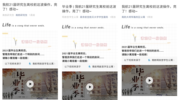 硕士毕业生们积极响应,不少毕业生离校前清空宿舍,把干净整洁留给母校。阿姨们被他们的行动感动了,公寓服务中心特在两校区公众号发布清空宿舍房号信息及所住学生的照片,同时邀请研究生院、学生事务服务中心公众号共同转发,为他们这种讲文明、有素质的精神品质点赞!