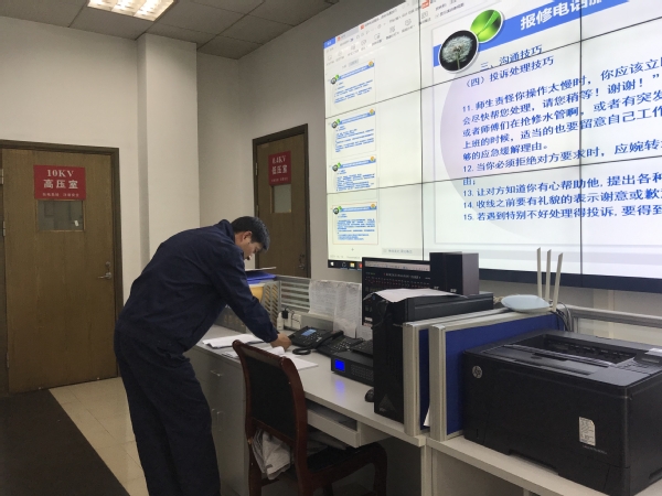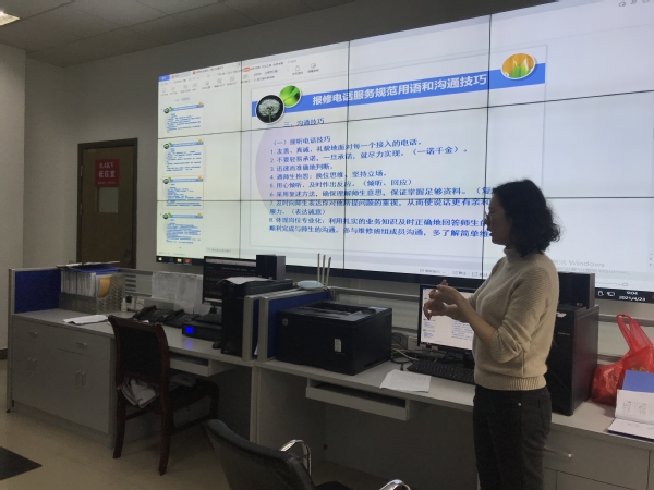 4月25日上午,在水电与维修服务中心明故宫校区的三楼会议室也开展了相同的培训,在中心主任周思军和副主任刘如的共同主持下,为明故宫校区的总值班接听人员和电站所有的工作人员进行了系统全面的“报修电话服务规范用语和沟通技巧培训”。两校区在培训结束后,将会全面贯彻此次培训的内容和宗旨,今后为全校师生提供更优质更贴心的服务。