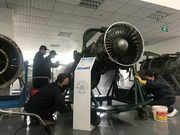 航天日作为大型开放型活动,级别高、影响大、会场多。明故宫校区航空馆是学校的重要航空航天展览场馆,为保证场馆及陈列展品设施干净整洁,明故宫物管部提前制定深度保洁工作计划,特别是对于飞行器等重要展品的表面开展专业化清洗作业。为了确保彻底清洁到位,采用智能蒸汽清洗发动机细小零件区域,清除污迹与油垢、清洗飞机底部及表面灰尘、冲刷地面,大家按照工作流程认真完成每一项作业。一遍作业完成后,立即进行仔细检查,对机身细节之处,立即进行二次及多次作业,反复处理打磨。物业人以百分百的用心对待工作,确保陈列飞行器的完美呈现。物业人严谨认真、不怕苦、不怕累的工作态度得到了学校老师的认可。