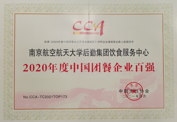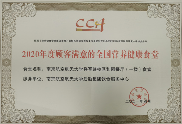 中国国际团餐产业大会是团餐行业内最具影响力与权威性的盛会之一。会上,南航后勤集团饮食服务中心荣获“2020年度中国团餐百强”荣誉称号,是全省170余所高校中唯一入选百强的单位;南航将军路校区和园餐厅(一楼)荣获“2020年度顾客满意的全国营养健康食堂”荣誉称号。