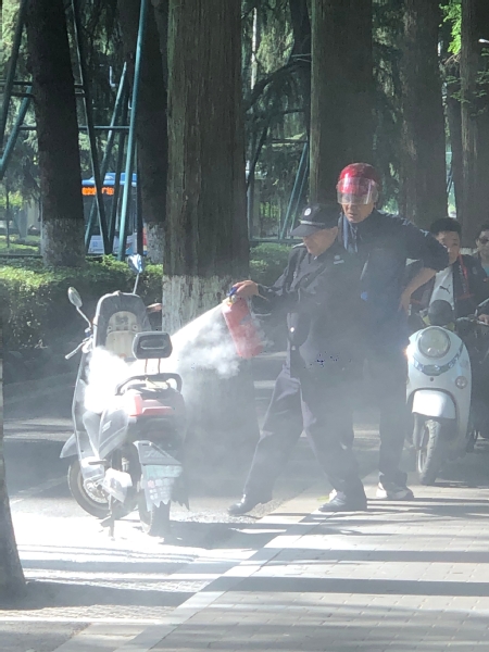4月30 日上午,御苑宾馆房务部主管黄泽钰正与门卫领班高远顺安排工作事宜,突然一位路人慌慌张张的边跑边大喊着:“快来帮忙灭火”。只见在离宾馆10米不到的地方,停着一辆正在燃烧的电动车,周围浓烟滚滚。这时高远顺毫不犹豫地放下了手中的工作,拿起门卫室里的灭火器冲向了冒烟起火的电瓶车,运用在接待服务中心消防演练学习的救火常识,对准起火部位的根部直喷。黄泽钰则来到起火车辆旁边,当起了临时指挥员,当时正值上班高峰期,路上行人和非机动车非常多,他紧急疏散周边车辆与行人,阻止了过路电瓶车靠近。在他们的共同努力下,电瓶车的火点在1分钟不到的时间里被扑灭,成功避免了人员的伤亡,保证了周围群众的人身安全。