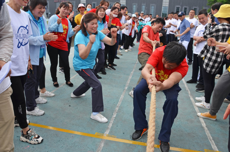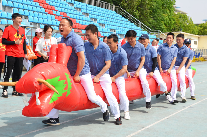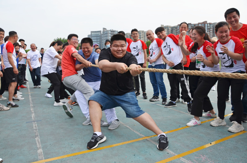 表演项目“拔河”比赛把活动推向高潮。集团从各个中心(单位)抽调身强力壮的员工,混编组成“勇往直前”“壮志凌云”“奋发图强”“斗志昂扬”四支拔河队伍。观众呐喊助威、队员奋力拼搏,充分展现“团结就是力量”,最终“勇往直前”队拔得头筹。