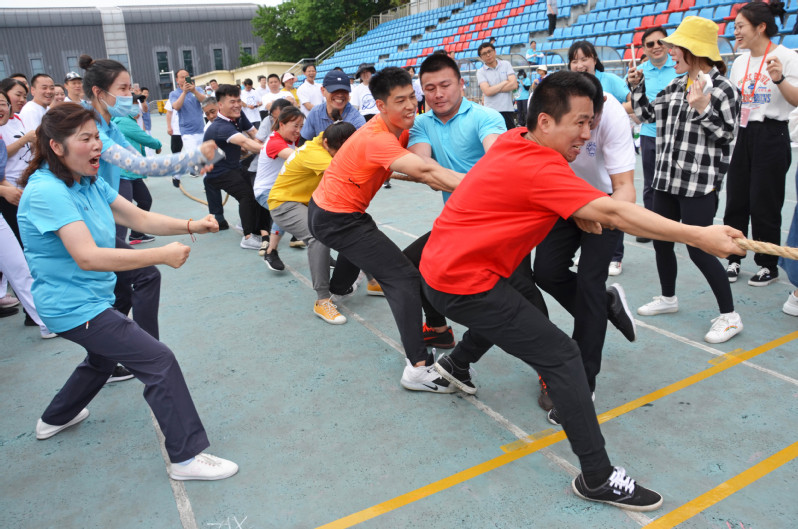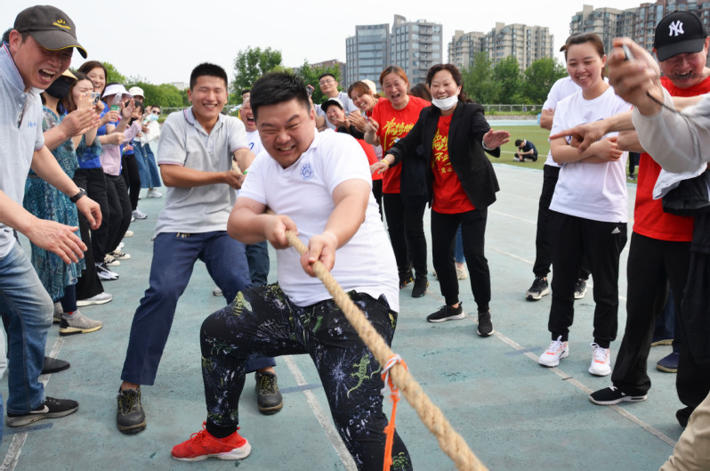 表演项目“拔河”比赛把活动推向高潮。集团从各个中心(单位)抽调身强力壮的员工,混编组成“勇往直前”“壮志凌云”“奋发图强”“斗志昂扬”四支拔河队伍。观众呐喊助威、队员奋力拼搏,充分展现“团结就是力量”,最终“勇往直前”队拔得头筹。