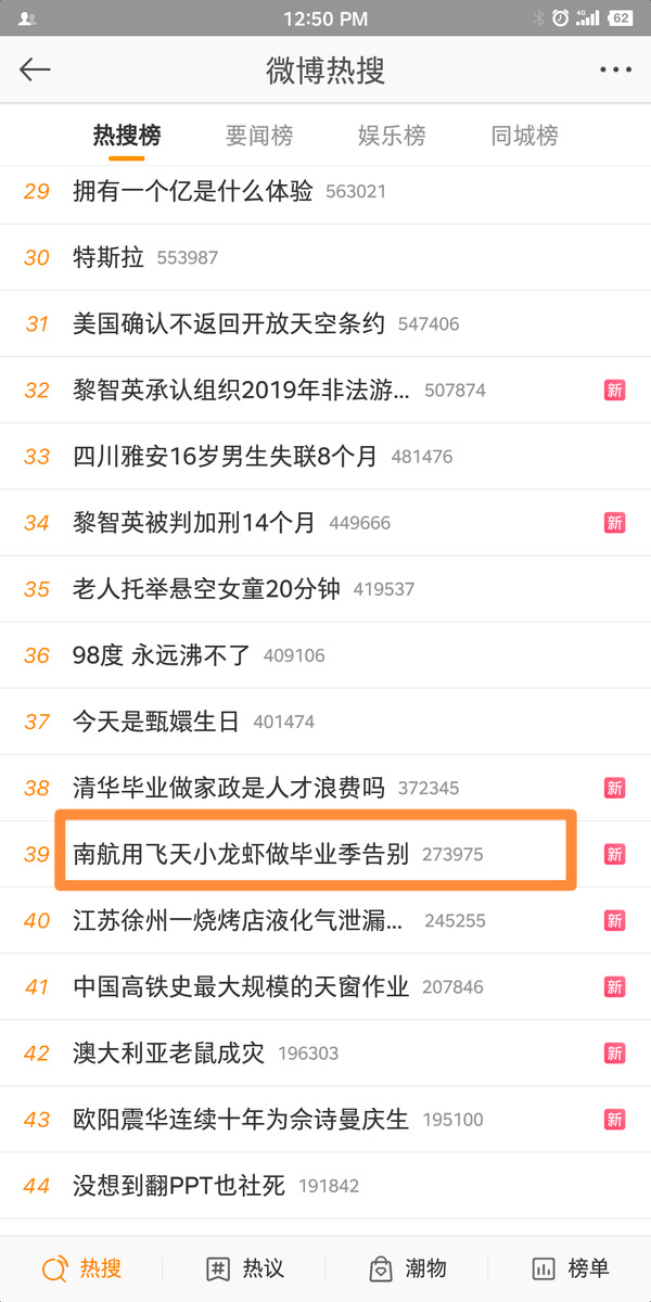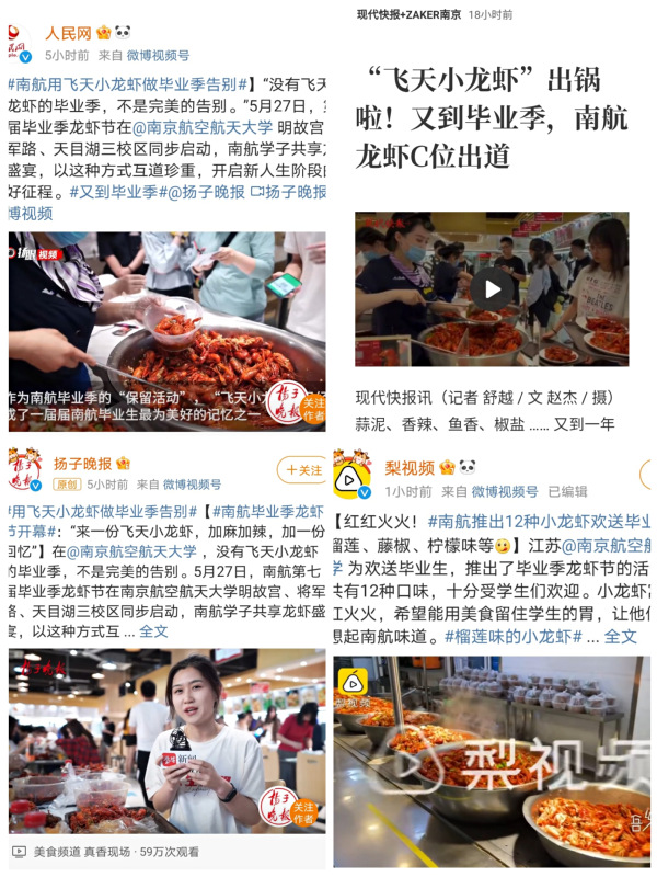 本次龙虾节的盛大举办在受到师生欢迎的同时,也因为“用美食告别毕业学子,表达深切祝福”这一情怀吸引广大媒体的关注,人民网、江苏卫视、现代快报、扬子晚报、南京头条各大权威媒体进行了集中报道,“南航用飞天小龙虾做毕业季告别”词条登上微博热搜,阅读量达到1877万人,飞天小龙虾的“南航味道”被网友纷纷点赞。