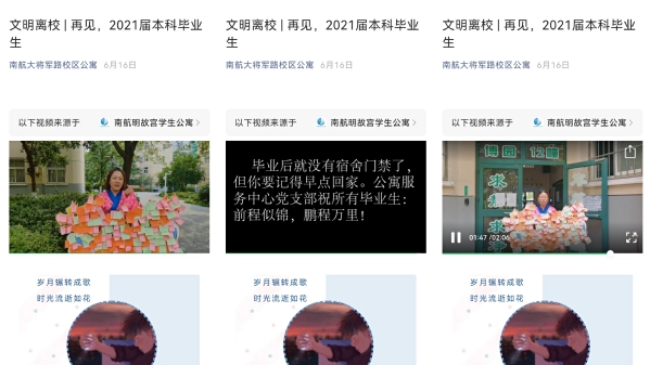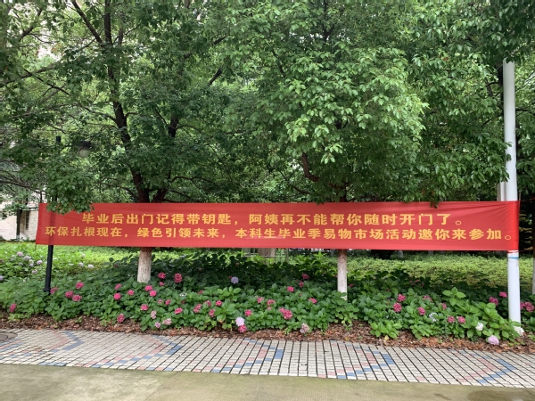 为营造浓郁的离校爱校氛围,公寓服务中心党支部拍摄制作祝福视频,通过微信公众号线上推广,视频一经发布,迅速引发南航学生的热烈转载。“毕业之后就没有宿舍门禁了,但你要记得早点回家”、“书上说:天下无不散的宴席,但不要怕,书上还说:人生何处不相逢。”......同时,公寓服务中心党支部在毕业生楼栋挂起横幅,以表达公寓阿姨们对毕业孩子们的祝福。